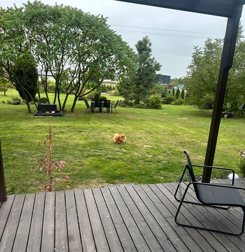 "Meldujemy, że wszystko u nas w jak najlepszym porządku. Chłopak jest super, zdrowiutki, nie ma żadnych problemów. Uwielbia spacerować po działce w deszczu 😅Dziękujemy jeszcze raz za wspaniałego towarzysza !!"
