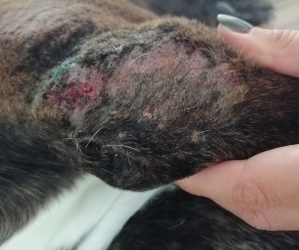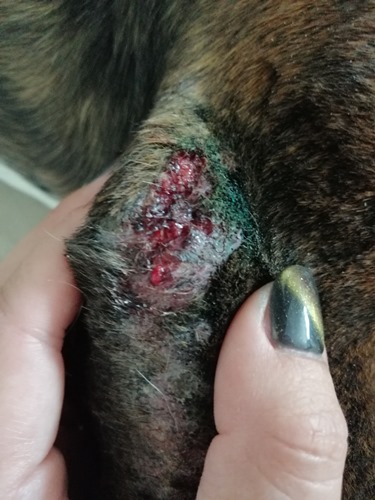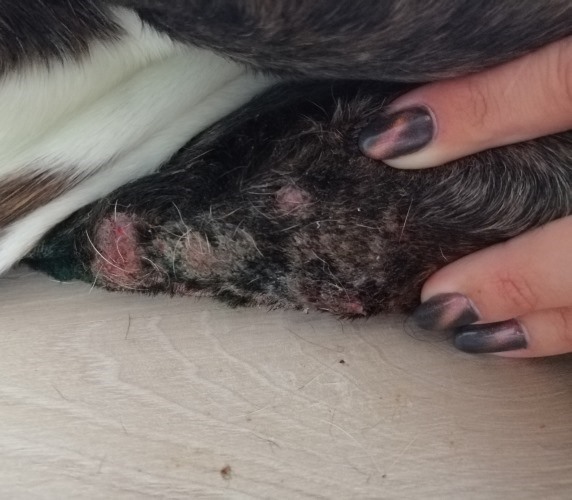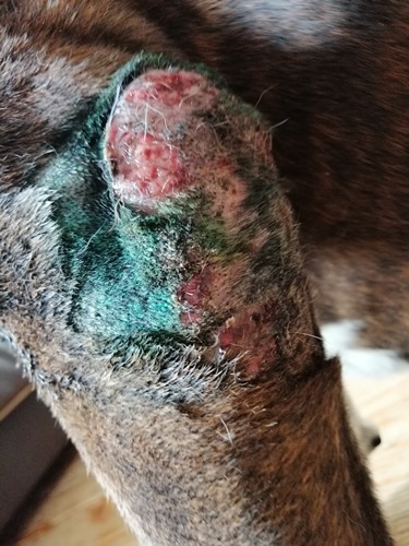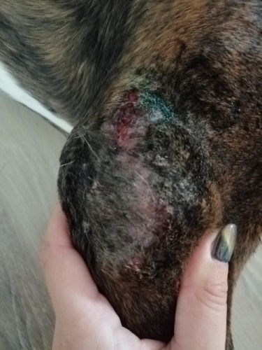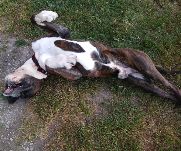 "Orion bardzo zaaklimatyzował się w domu tymczasowym. Nie sprawia problemów, choć ma swój charakterek i lubi postawić na swoim, ciągle coś próbuje. Przytył, już nie jest taki chudy i teraz wygląda już normalnie, tak jak powinien. Jest bardzo sprytny, potrafi wynaleźć piłkę nawet schowaną za zasłoną na parapecie dużo wyższym niż on sam - ma psi szósty zmysł, zawsze wie gdzie jego zabawki :) Poczatkowo bardzo zakochany w rezydencie Hektorze (bokser 8 lat), teraz adoruje go mniej, ale nadal się bardzo lubią i dogadują się idealnie. Orion nie przepada za to z wzajemnoscią za suczką sąsiadów w typie owczarka, zawsze się muszą oszczekać przez ogrodzenie nim pójdziemy na spacer. Łokcie całkowicie się zagoiły po antybiotykoterapii i stosowaniu maści, teraz tylko nowy włos musi na nich odrosnąć."