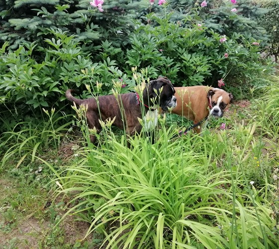 Bokser ma do dyspozycji olbrzymią działkę, po której może do woli szaleć z zabawkami.