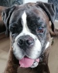 "Orion to super psiak. Wesoły i przyjacielski. Na razie jest lekko zdezorientowany, ale ogólnie jest grzeczny. Bokser ma swój "charakterek" i nie pozwoli sobie wejść na głowę, zna komendy np siad i leżeć, ale wykonuje je (lub nie :)) a potem od razu leci dalej gdzie go dusza poniesie :) W domu odnalazł się bardzo dobrze, jakby był tu całe życie, testuje mnie caly czas co więcej mu wolno, do łózka najpierw podchodził po trochu, a potem po prostu się na nim rozłożył wzdłuż i wszerz. Umie jeździć autem, w miarę trzyma czystość w domu (przy ekscytacji zdarzają się drobne wpadki). Jest zakochany w rezydencie Hektorze, chodzi za nim krok w krok, nie odstępuje go nawet na pół metra. Na ten moment Hektor to największy idol, z tej miłości jest caly "opluty od stóp do głów", bo Orion cały czas go wylizuje, a to ucho, a to oko, Hektor cały polizany. Do psów Orion jest przyjazny lub też ma neutralny stosunek, aczkolwiek odburknie na natręta, jeśli nie ma ochoty być np wąchany. Zna kanapę i łożko, lubi wejść tam gdzie może się wygodnie wyłożyć. Niestety nie za bardzo umie się bawić zabawkami, nie wie w ogóle po co one są. Pobiegnie za rzuconą zabawką i nie wie co dalej ma robić. Orion jest jednym z tych wyższych bokserów, w tej chwili jesy za chudy, obecnie wazy około 30 kg, po odkarmieniu powinien wazyć między 35 a 40 kg. Ma dość dużo siły i nie do końca jest nauczony chodzenia na smyczy. U weterynarza pozwala sobie wszystko zrobić, nawet przy modzelach, które raczej są bolesne.