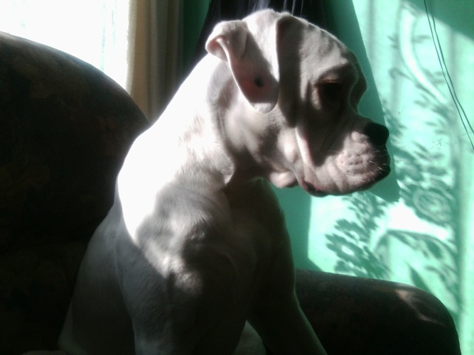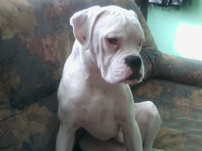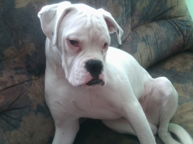 Gordon to 7 miesięczny, biały bokser, który pilnie szuka nowego domu.