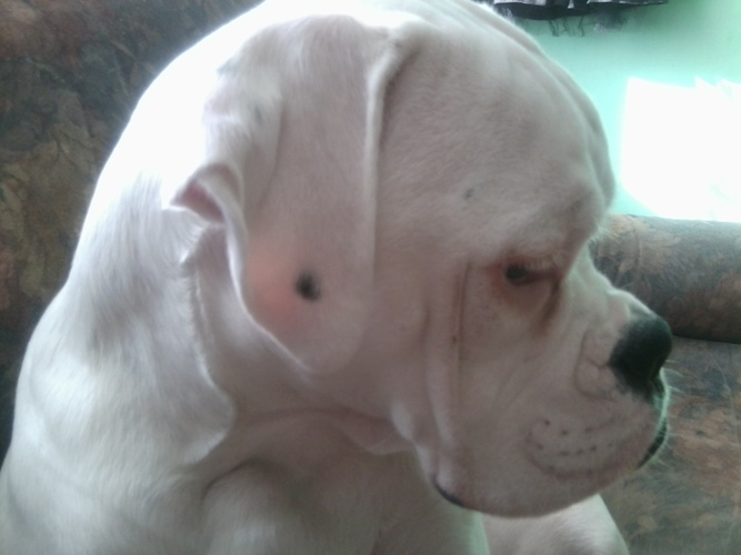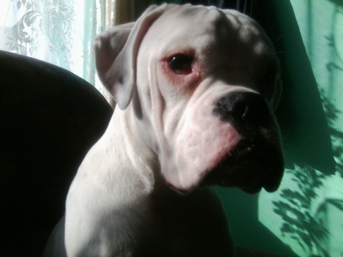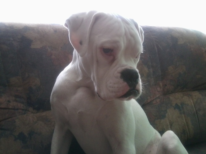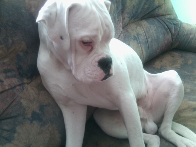 Gordon to piękny biały,7 miesięczny bokser, któremu się nie poszczęściło.