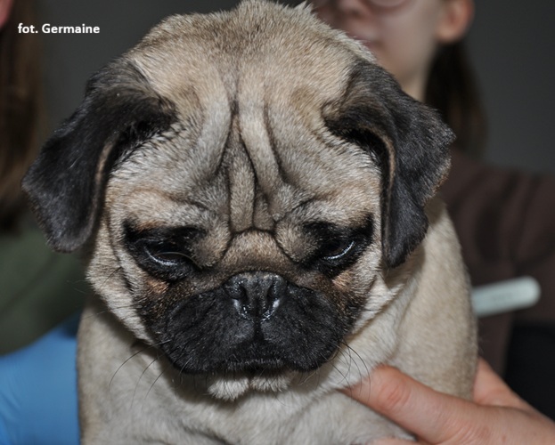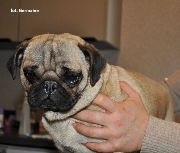 Alena jest bardzo przyjaźnie nastawioną mopsiczką, dogaduje się bez problemu z innymi psami, uwielbia jeść.