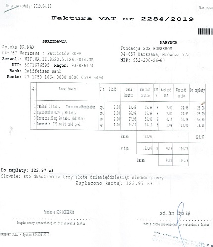 Leki w aptece to koszt: 70 zł, fvat numer 2284/2019.