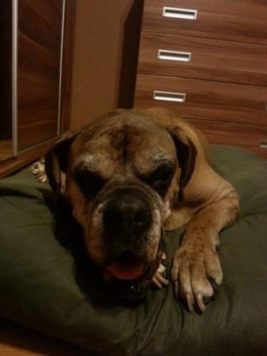 Od czasu, gdy zagościł u nas szczeniak Karmelek (był tylko jedną dobę), postępy Kinia są piorunujące.. Kinio uciekając przed małym sam (bez żadnej pomocy!!!!!!!) wskoczył na tapczan, od tego czasu Kinio również zaczął pięknie chodzić, nawet po śliskich kafelkach i panelach w pokoju (jeszcze niekiedy traci równowagę). Jak tak dalej będzie to mam nadzieję, że w wakacje już będzie biegał!! Kiniuś zachowuje się jak szczeniak, jego zegar biologiczny tyka w odwrotną stronę, z dnia na dzień mam wrażenie, że jest młodszy. King jest zakochany w rezydentce Lunie, razem się bawią, śpią na jednym posłanku, przytulają się, taka bokserkowa prawdziwa miłość. Przesyłam kilka fotek mojego stada."