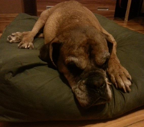 Kinio trafił do schroniska 31.03.2011, bokser był bardzo zrezygnowany i osowiały, po kilku dniach już nie wstawał, przestał chodzić.
